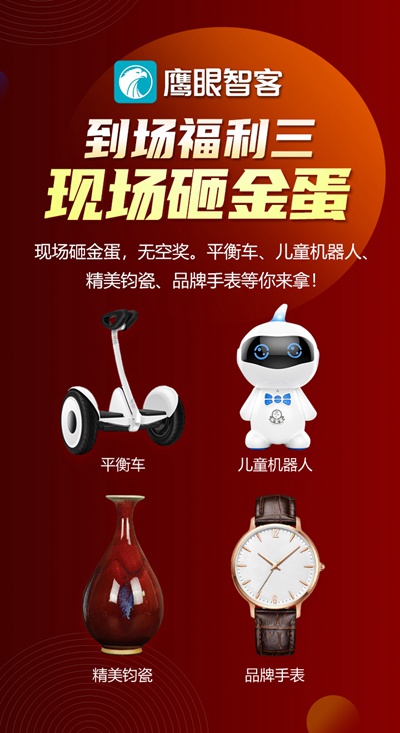現(xiàn)場砸金蛋,無空獎。平衡車、兒童機器人、精美鈞瓷、品牌手表等你來拿!